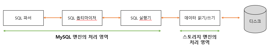 MySQL 엔진은 요청된 SQL 문장을 분석하거나 최적화하는 등 DBMS의 두뇌에 해당하는 처리를 수행한다고 할 수 있다.
