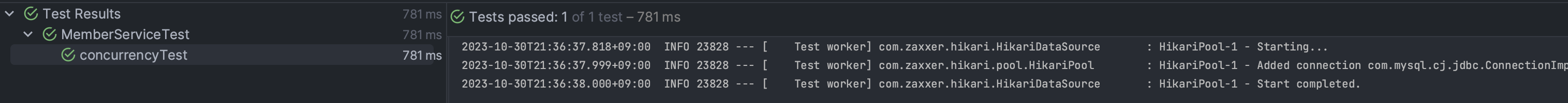 테스트를 실행하면 통과한 것을 확인할 수 있다. 따라서 DuplicateKeyException 예외에 대한 로직도 추가해줘야 하는데 @ControllerAdvice로 처리할지, Service 계층에서 try-catch 블록으로 예외를 변환하는 것이 좋을지는 한 번 고민해봐야 할 것 같다.