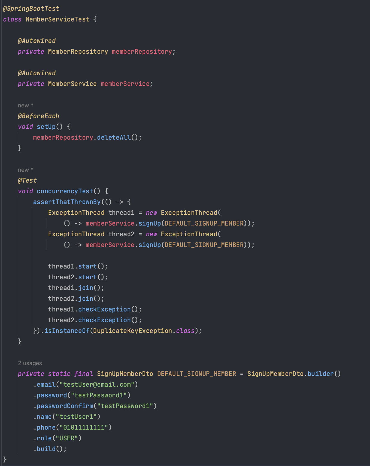 두 스레드가 거의 동시에 진행되고, join 메서드를 통해 두 스레드 작업이 끝날 때까지 기다린 후 checkException 메서드를 통해 위에서 예상한 것처럼 DuplicateKeyException 예외가 발생하는지를 확인하는 테스트이다.