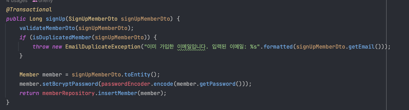 - if (isDuplicatedMember(_)) { ... }: 만약 이미 가입한 이메일이 있으면 EmailDuplicationException 예외가 발생한다.