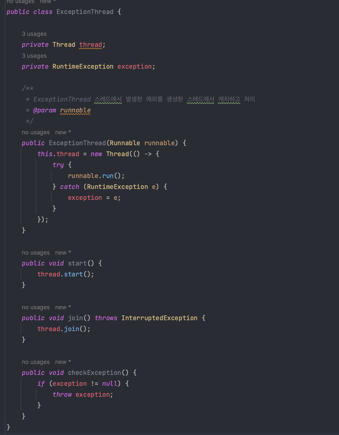 위 클래스는 스레드 내에서 발생한 예외를 캐치하고 처리하기 위한 클래스이다. 예를 들어, t1 스레드가 생성한 t2 스레드에서 발생한 예외를 t1 스레드에서 처리하기 위해서 생성자를 보면 try-catch 블록으로 둘러싸여 있는 것을 확인할 수 있다. 만약 t2 스레드에서 예외가 발생하면 t1 스레드 catch 블록에서 예외를 인스턴스 변수인 exception에 저장하도록 작성했다. 그리고 t2 스레드에서 예외가 발생했는지 확인하기 위해서 checkException 메서드를 이용하여 확인할 수 있다.