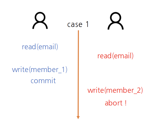 위 과정을 DB 트랜잭션 관점으로도 살펴보자. 결국 두 명의 사용자가 같은 email로 회원가입 요청을 보냈어도 아직 DB에는 해당 email에 대한 레코드가 존재하지 않기 때문에 두 트랜잭션 모두 read(email) 이후 각각 write(member_1), write(member_2) 쓰기 작업을 수행하게 된다.