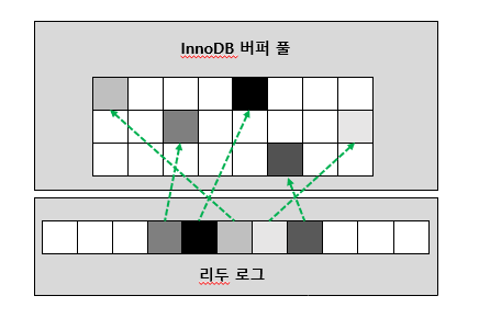 따라서 InnoDB 버퍼 풀의 더티 페이지는 특정 리두 로그 엔트와 관계를 가지고, 체크포인트 이벤트를 발생시켜 체크포인트 LSN(Log Sequence Number)보다 작은 리두 로그 엔트리와 관련된 더티 페이지는 모두 디스크로 동기화되어야 한다. 당연히 체크포인트 LSN보다 작은 LSN 값을 가진 리두 로그 엔트리도 디스크로 동기화되어야 한다.