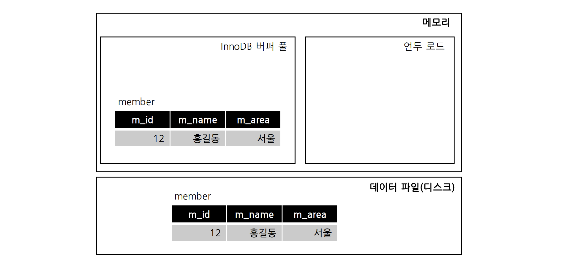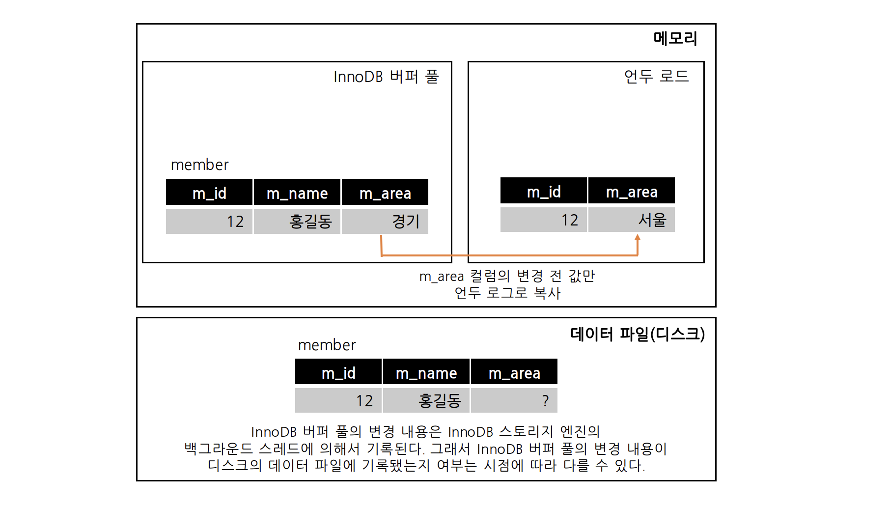 UPDATE 문장이 실행되면 커밋 실행 여부와 관계없이 InnoDB의 버퍼 풀은 새로운 값인 '경기'로 업데이트된다. 그리고 디스크의 데이터 파일에는 체크포인트나 InnoDB의 Write 스레드에 의해 새로운 값으로 업데이트될 수도 있고 아닐 수도 있지만 InnoDB가 ACID를 보장하기 때문에 일반적으로는 InnoDB의 버퍼 풀과 데이터 파일은 동일한 상태라고 가정해도 무방하다.