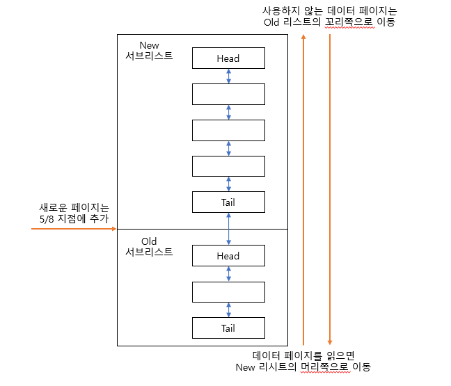 - 디스크에서 필요한 데이터 페이지를 버퍼 풀에 적재하고, 적재된 페이지에 대한 포인터를 LRU 헤더 부분에 추가