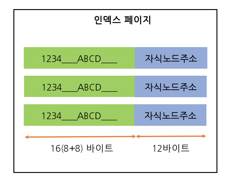 일반적으로 DBMS의 B-Tree는 자식 노드의 개수가 가변적인 구조로 인덱스의 페이지 크기와 키 값의 크기에 따라 결정된다. InnoDB 스토리지 엔진의 페이지 크기를 innodb_page_size 시스템 변수를 이용해 4KB ~ 64KB 사이의 값을 선택할 수 있지만 기본값은 16KB다. 인덱스가 16바이트라 가정하면 위 그림처럼 인덱스 페이지가 구성된다. 자식 노드 주소라는 것은 대량 6바이트에서 12바이트까지 다양한 크기의 값을 가질 수 있으며 평균적으로 12바이트로 구성된다고 가정하면 16*1024/(16+12) = 585개의 자식 노드를 가질 수 있다. SELECT 쿼리가 300개를 읽어야 한다면 최소한 2번 이상 디스크를 읽어야 한다. 결국 인덱스를 구성하는 키 값의 크기가 커지면 디스크로부터 읽어야 하는 횟수가 늘어나고, 그만큼 느려진다는 것을 의미한다.