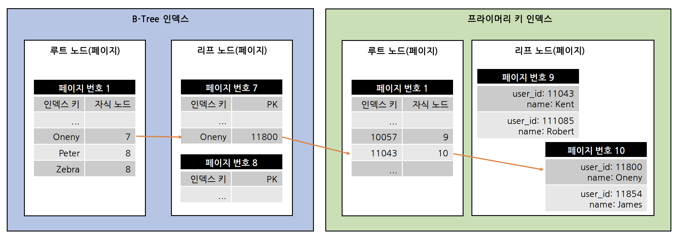 - 2번에서 읽어들인 인덱스 키와 레코드 주소를 이용해 레코드가 저장된 페이지를 가져오고, 최종 레코드를 읽어온다.