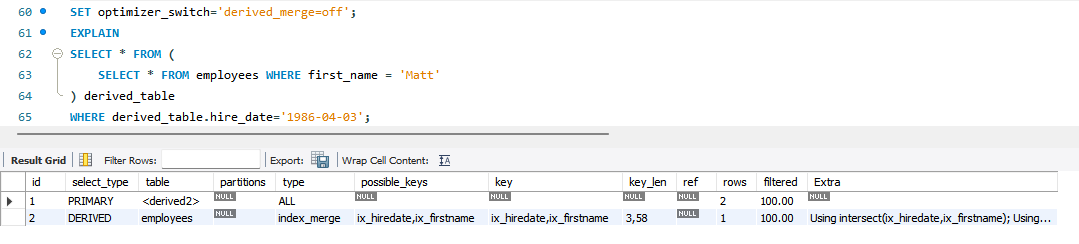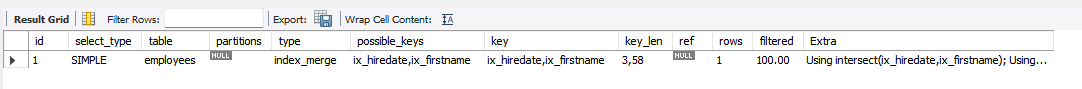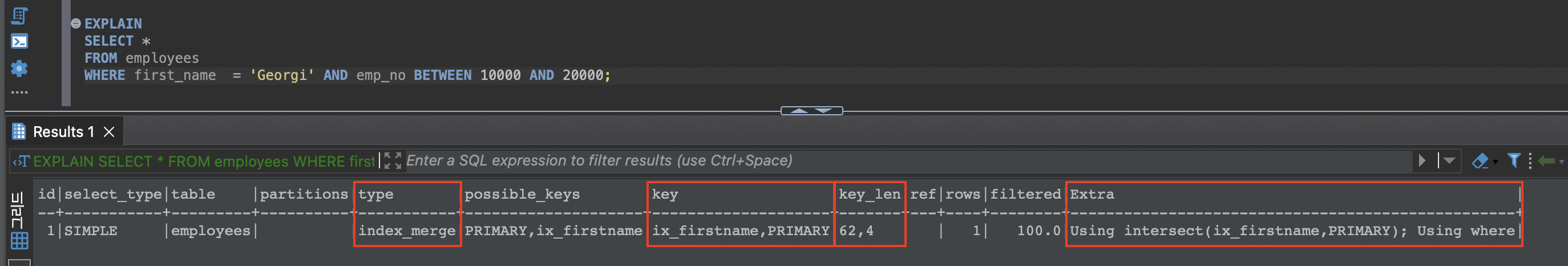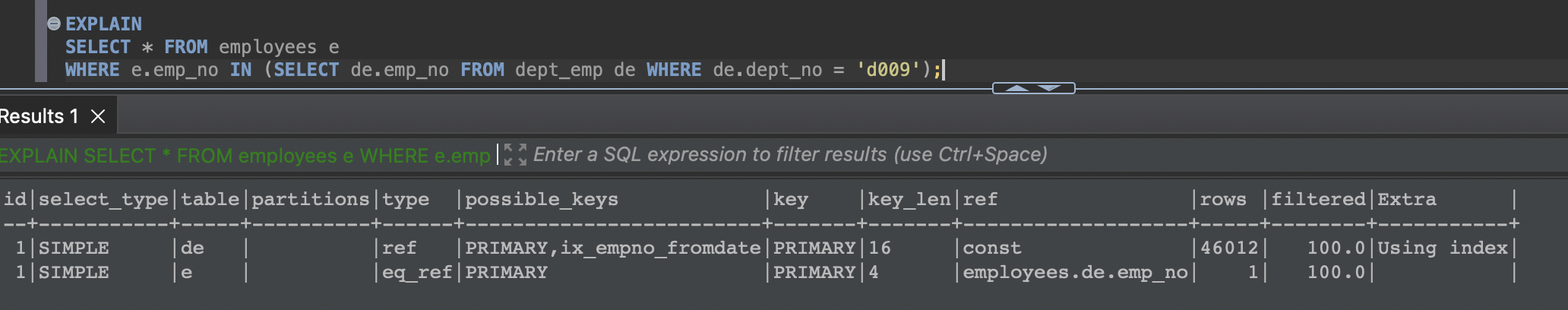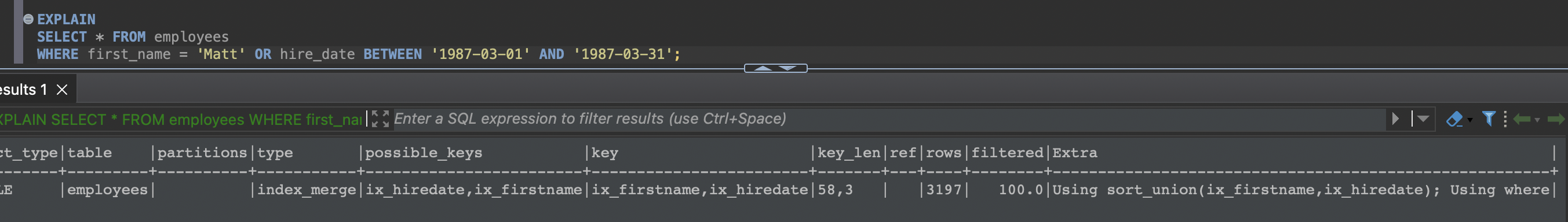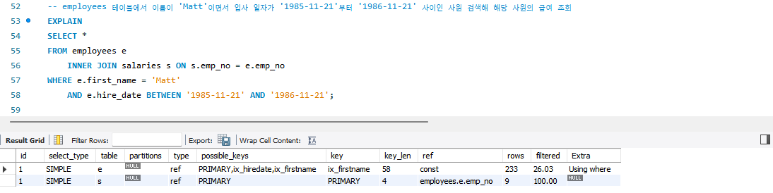 상황에 따라 1번이 효율적일 수도 있고, 2번이 효율적일 수도 있다. 일반적으로 hire_date 컬럼의 조건에 부합되는 레코드 건수가 많지 않다면 1번이 효율적인데 가끔 MySQL 옵티마이저가 잘못된 실행 계획인 2번 실행 계획을 선택하는 경우가 있다.