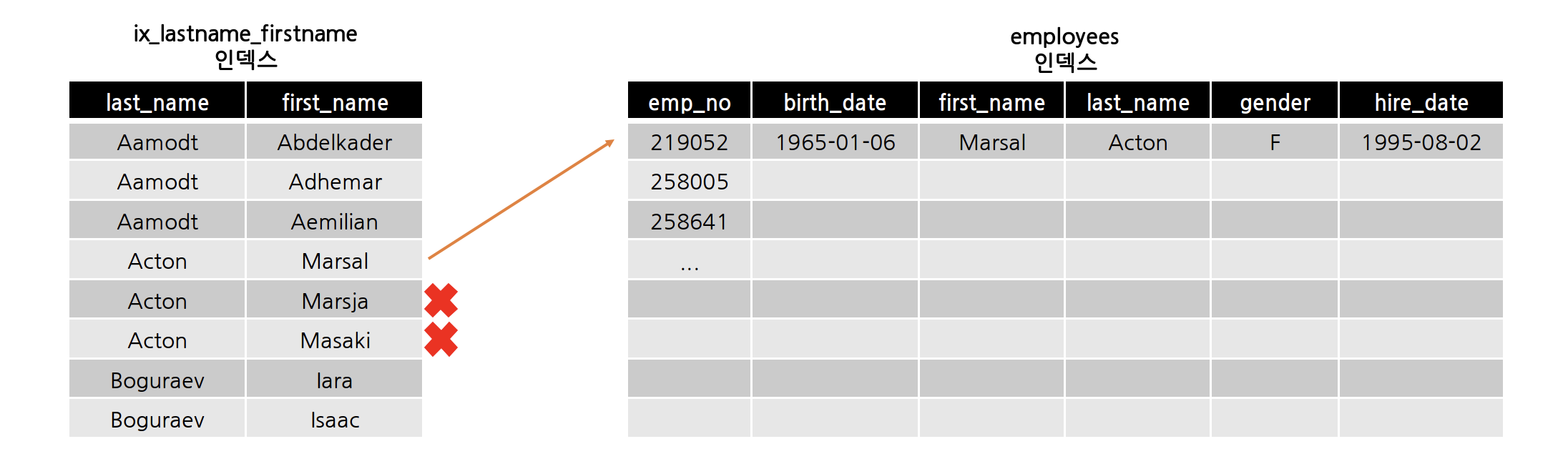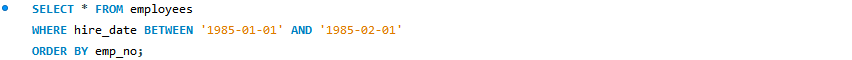 - ix_hiredate 인덱스를 이용해 "hire_date BETWEEN '1985-01-01' AND '1985-02-01'" 조건에 일치하는 레코드를 찾은 다음, emp_no로 정렬해서 결과를 반환