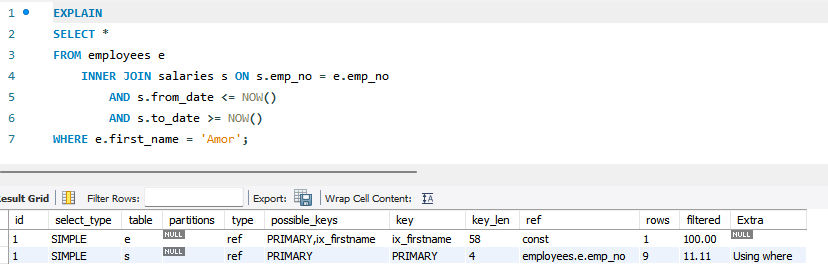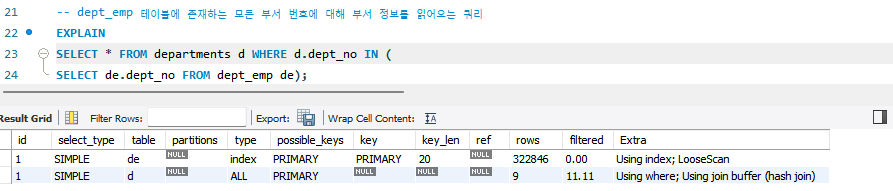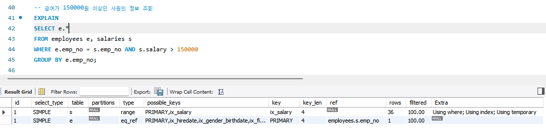 ORDER BY e.emp_no; -- // emp_no 컬럼으로 정릴이 필요한데, 인덱스를 사용하면서 자동 정렬된다고