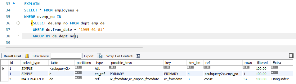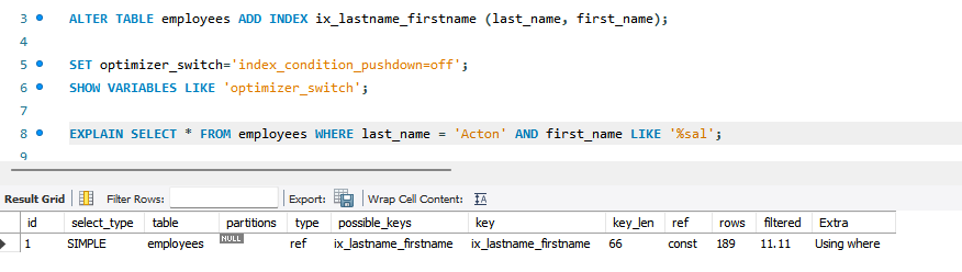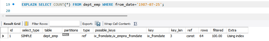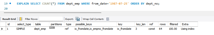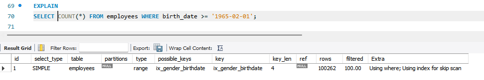 mysql> SELECT /** SKIP_SCAN(employees)*/ COUNT(*) FROM employees WHERE birth_date >= '1965-02-01';