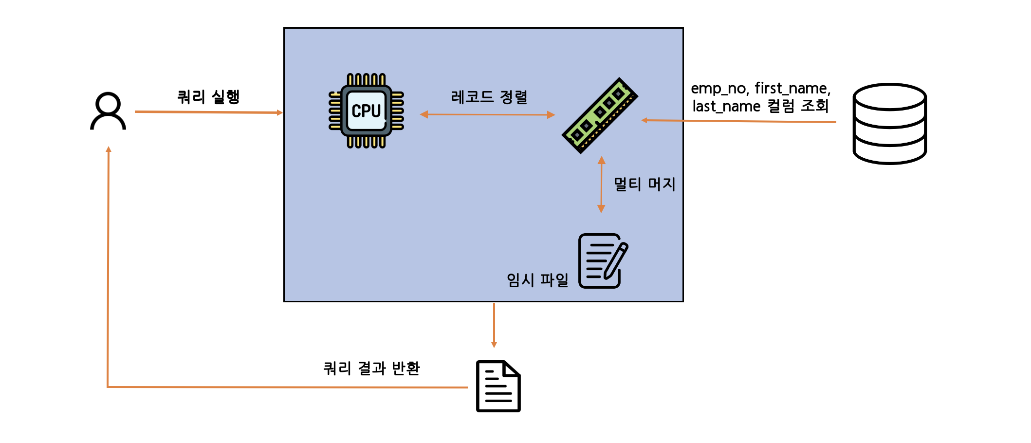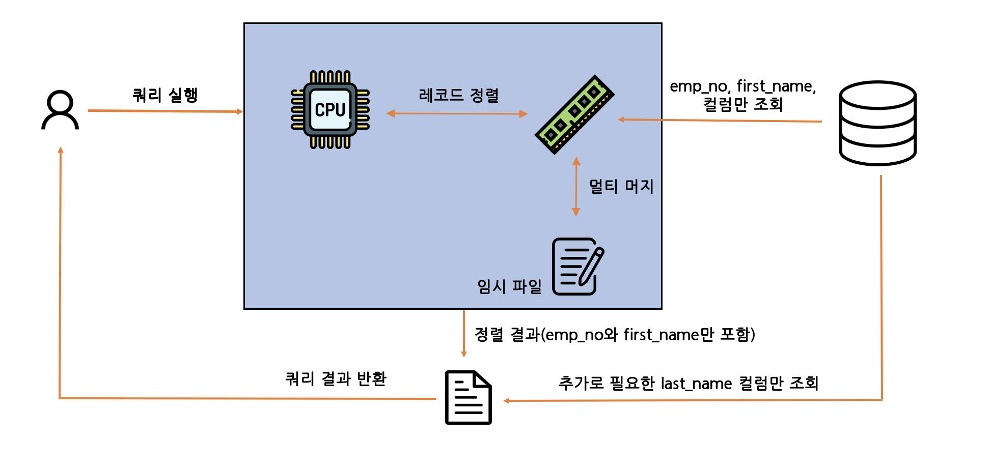 그림에서 알 수 있듯이, 처음 employees 테이블을 읽을 때 정렬에 필요하지 않은 last_name 컬럼까지 전부 읽어서 소트 버퍼에 담고 정렬을 수행한다. 그리고 정렬이 완료되면 정렬 버퍼의 내용 그대로 클라이언트로 넘겨주는 과정을 볼 수 있다.