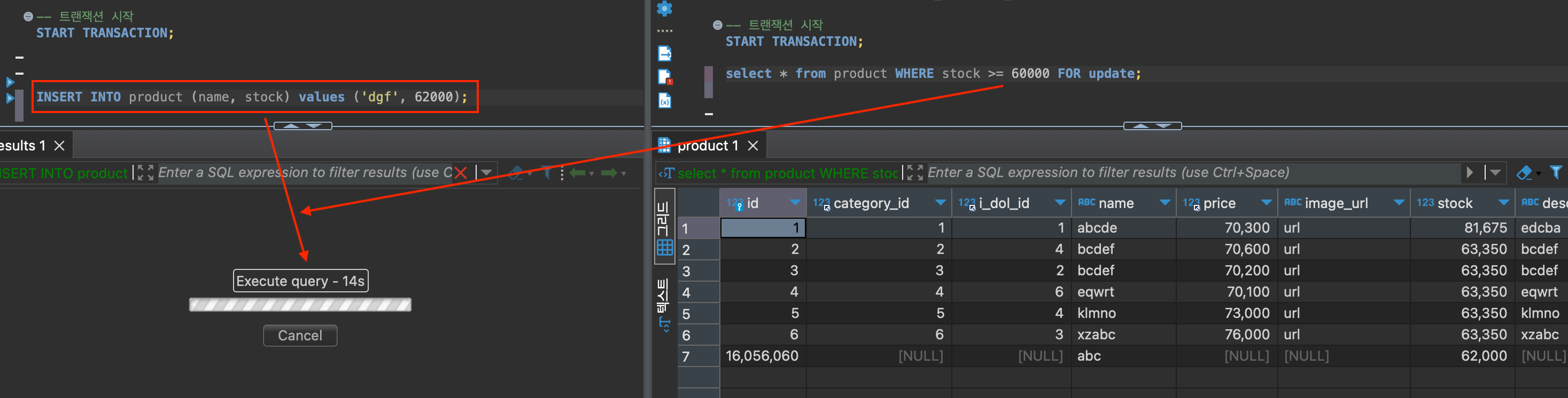 2024.02.11일에 업데이트된 내용인데 REPEATABLE READ로 격리 수준을 사용하는 경우에는 stock에 대한 넥스트 키 락으로 인해 다른 트랜잭션에서 쓰기 작업이 진행되지 못하는 것을 확인할 수 있다.