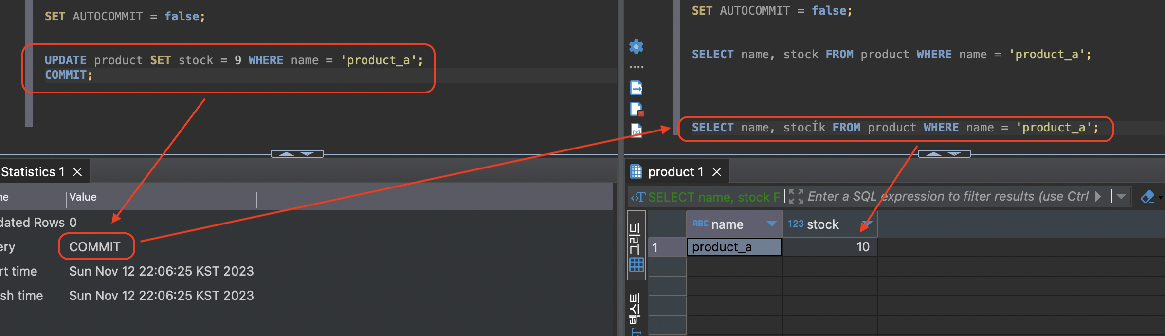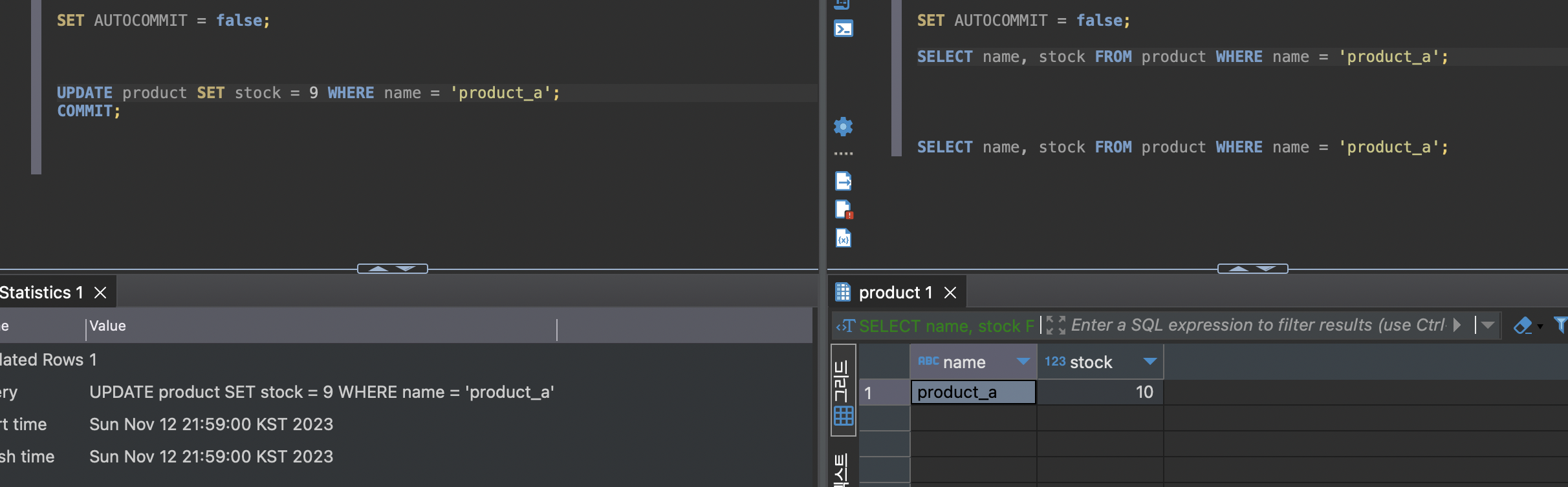 - 트랜잭션 A(왼쪽)가 데이터를 수정 후 커밋