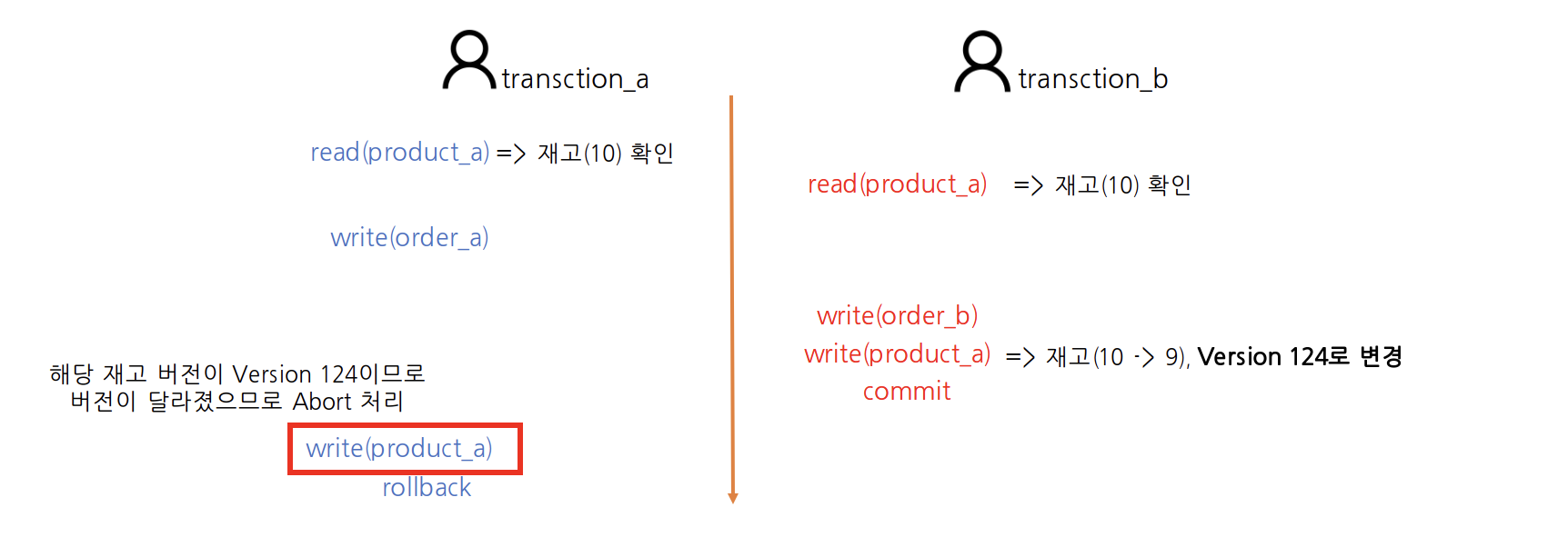 위 그림을 보는 것처럼 같은 레코드에 대해 각기 다른 2개의 수정 요청이 있었지만 1개가 업데이트됨에 따라 version이 변경되었기 때문에 뒤의 수정 요청은 반영되지 않게 되었다. 이렇게 낙관적 락은 version과 별도의 컬럼을 추가하여 충돌적인 업데이트를 막는다. 또는 커밋할 때 다시 해당 행의 version을 확인하여 업데이트를 충돌을 막기도 하는데 컬럼은 version 뿐만 아니라 timestamp를 이용하기도 한다.