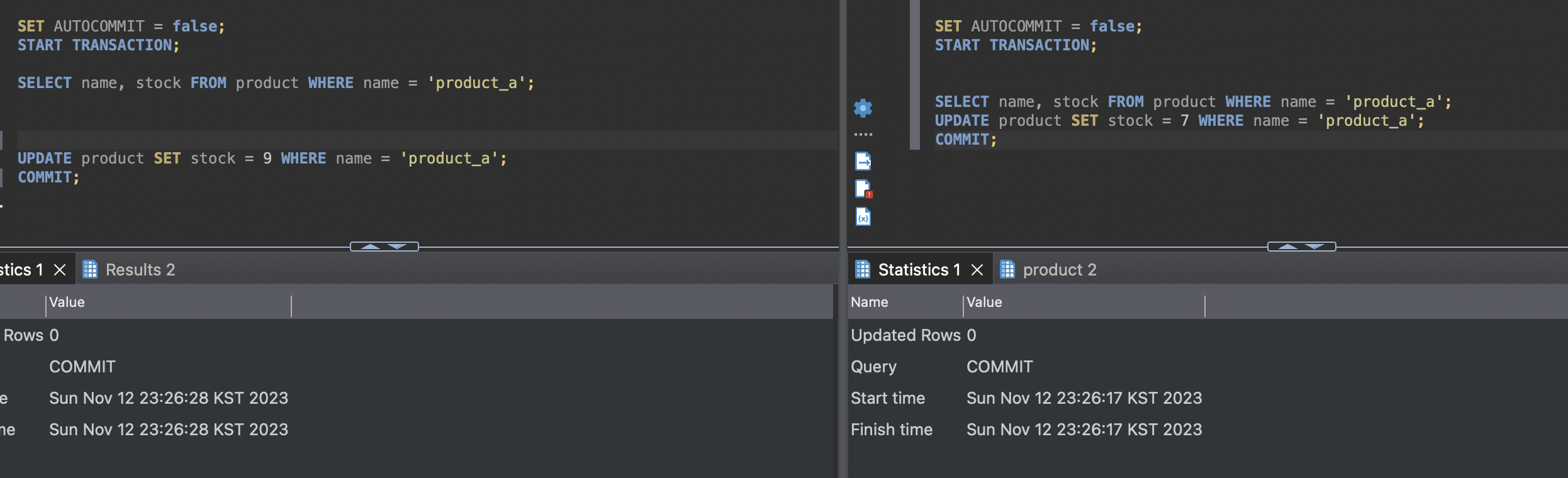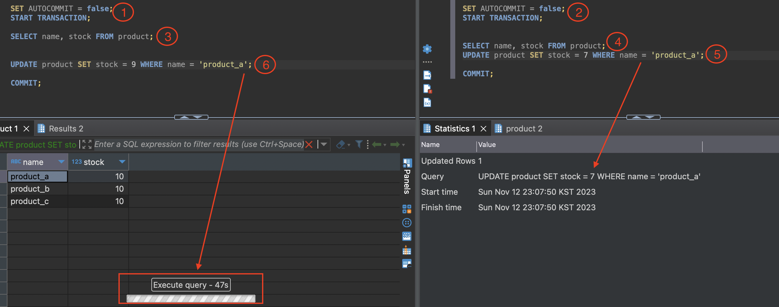 위 사용자가 동시에 상품을 구매하는 트랜잭션 중 하나의 순서는 위와 같을 것이다. InnoDB 테이블을 사용하는 테이블에서는 UPDATE된 레코드에 대해서 배타락(Exclusive Lock)이 걸려 다른 트랜잭션에서 동시에 수행하지 못하도록 하여 commit되지 않은 데이터를 write하는 Dirty write 상황을 방지한다.