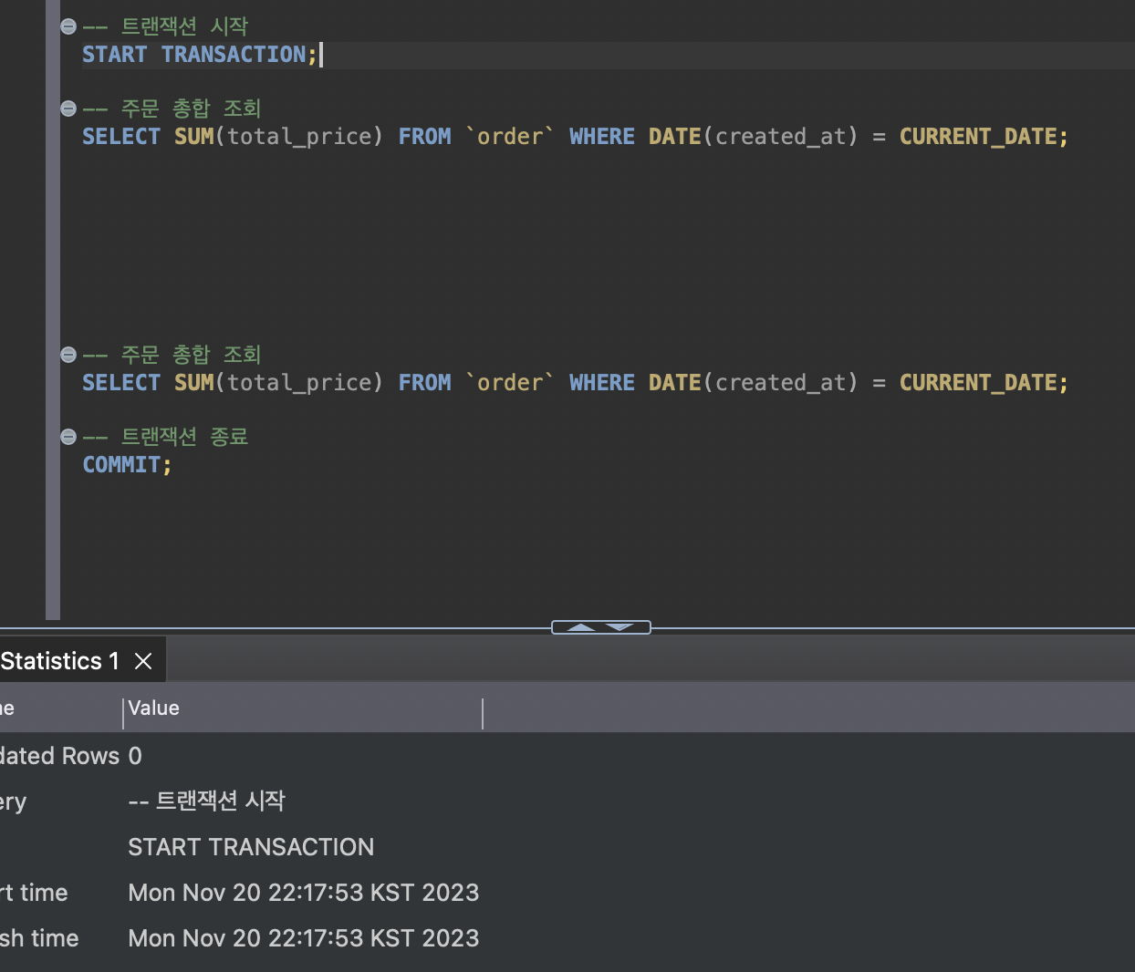 당일 주문 총합을 조회하려는 transaction_b 트랜잭션이 시작되었다고 가정해보자. 트랜잭션이 시작한 시간은 22:17:53이다.