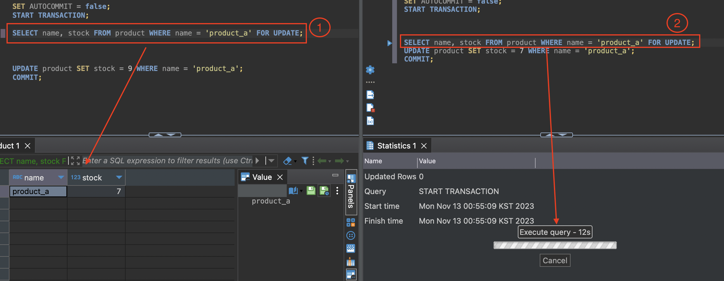 두 명의 사용자가 동시에 하나의 상품을 구매했다고 가정해보면 다음과 같은 로직의 순서가 이루어진다.