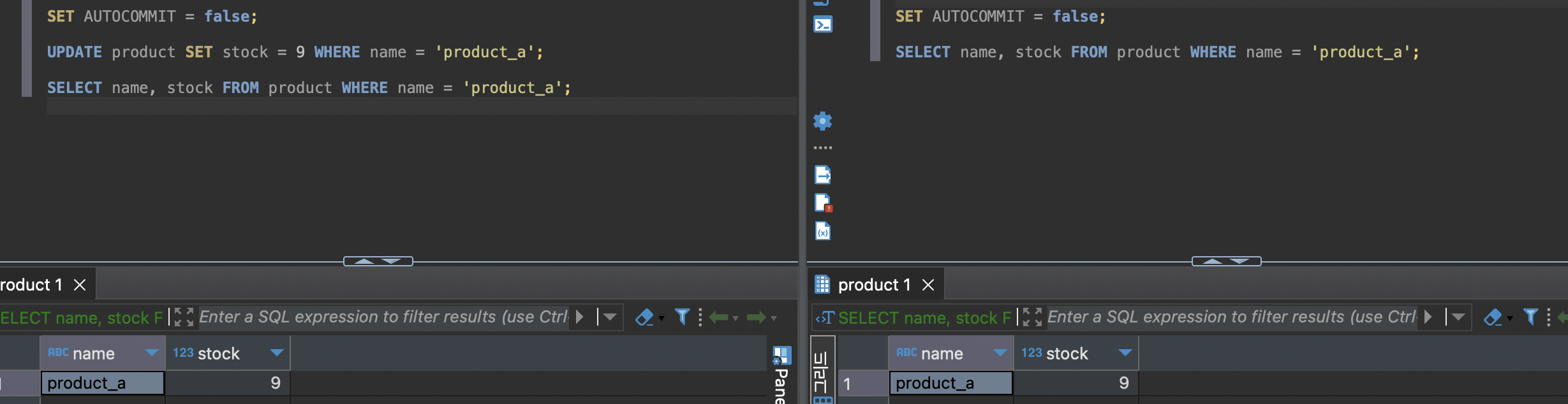 맨처음에 봤던 사용자가 동시에 상품을 구매하는 트랜잭션에서 정합성 문제가 발생할 수 있는 상황이다. 트랜잭션이 동시에 실행됐을 때 두 트랜잭션에서 모두 product_a 재고가 10으로 재고가 있는 것을 확인할 수 있다. 하지만 트랜잭션 B(오른쪽)에서 재고를 3개 차감하여 7개로 업데이트했지만 트랜잭션 A(왼쪽)에서 재고를 9개로 업데이트가 진행되면서 트랜잭션 B가 진행했던 내용을 사라져버린 것이다. 이렇게 업데이트를 덮어쓰는 현상을 Lost Update라고 한다.