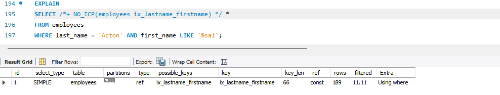 인덱스 컨디션 푸시다운(ICP, Index Condition Pushdown) 최적화는 사용 가능하다면 항상 성능 향상에 도움이 되므로 최대한 인덱스 컨디션 푸시다운 기능을 사용하는 방향으로 실행 계획을 수립한다. 하지만 인덱스 컨디션 푸시다운으로 인해 여러 실행 계획의 비용 계산이 잘못된다면 결과적으로 잘못된 실행 계획을 수립하게 될 수 있으므로 인덱스 컨디션 푸시다운 최적화만 비활성화해서 조금 더 유연하고 정확하게 실행 계획을 선택하게 할 수 있다.