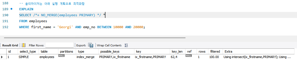MySQL 서버는 가능하다면 테이블당 하나의 인덱스만을 이용해 쿼리를 처리하려고 한다. 하지만 하나의 인덱스만으로 검색 대상 범위를 충분히 좁힐 수 없다면 사용 가능한 다른 인덱스를 이용하기도 한다. 여러 인덱스를 통해 검색된 레코드로부터 교집합 또는 합집합만을 구해서 그 결과를 반환하는데 하나의 테이블에 대해 여러 개의 인덱스를 동시에 사용하는 것을 인덱스 머지(Index Merge)라고 한다. 인덱스 머지 실행 계획의 사용 여부를 제어하고자 할 때, INDEX_MERGE와 NO_INDEX_MERGE 옵티마이저 힌트를 이용하면 된다.