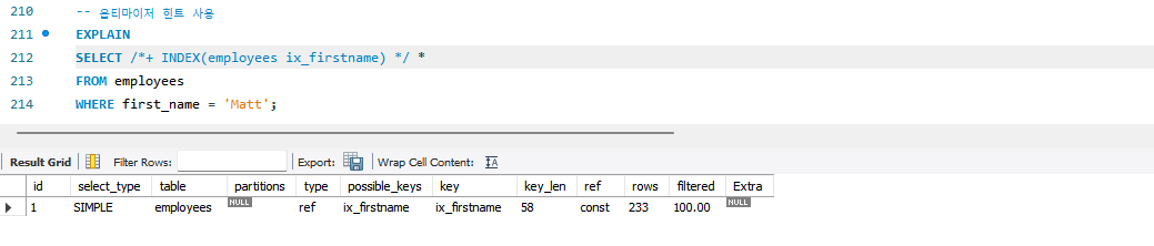 - FORCE INDEX: USE INDEX보다 옵티마이저에게 미치는 영향이 더 강한 힌트이지만 USE INDEX 힌트만으로 옵티마이저에게 미치는 영향은 충분히 크기 때문에 거의 사용할 필요가 없다.