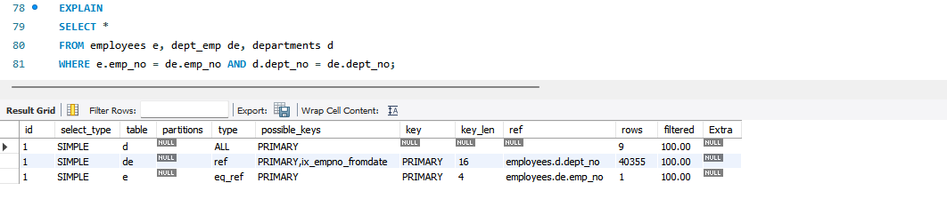 위 쿼리는 3개의 테이블을 조인하는데 옵티마이저는 그때그때 각 테이블의 통계 정보와 쿼리의 조건을 기반으로 가장 최적으로 판단되는 순서로 조인한다. 실행 계획을 보면 레코드가 적은 테이블인 departments 테이블을 드라이빙 테이블로 선택했고, 두 번째 dept_emp 테이블을 읽은 뒤에 마지막으로 employees 테이블을 읽었음을 알 수 있다.