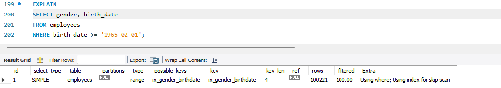 인덱스 스킵 스캔은 인덱스의 선행 컬럼에 대한 조건이 없어도 옵티마이저가 해당 인덱스를 사용할 수 있게 해주는 매우 훌륭한 최적화 기능이다. 하지만 조건이 누락된 선행 컬럼이 가지는 유니크한 값의 개수가 많아진다면 인덱스 스킵 스캔의 성능은 오히려 더 떨어질 수 있다. MySQL 옵티마이저가 유니크한 값의 개수를 제대로 분석하지 못하거나 잘못된 경로로 인해 비효율적인 인덱스 스킵 스캔을 선택하면 NO_SKIP_SCAN 옵티마이저 힌트를 이용해 인덱스 스킵 스캔을 사용하지 않게 할 수 있다.