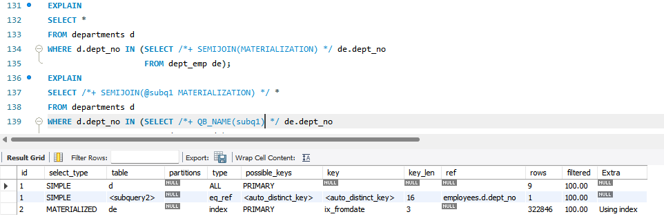 | Materializtion | SEMIJOIN(MATERIALIZATION) |