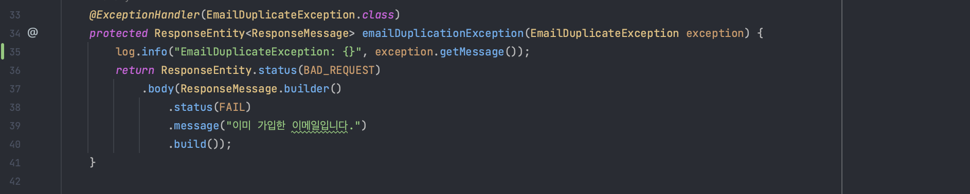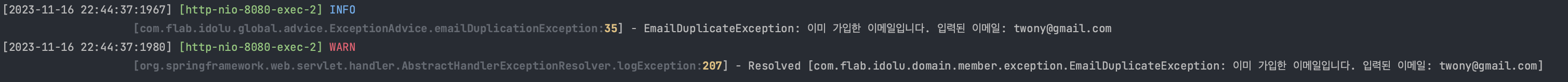 만약 이미 회원가입한 이메일이 있다면 EmailDuplicationException 예외가 발생하면서 로깅이 출력되는 로직을 작성했다. 만약 이미 가입한 이메일로 요청을 보내게 되면 위처럼 결과가 출력되는 것을 확인할 수 있다.