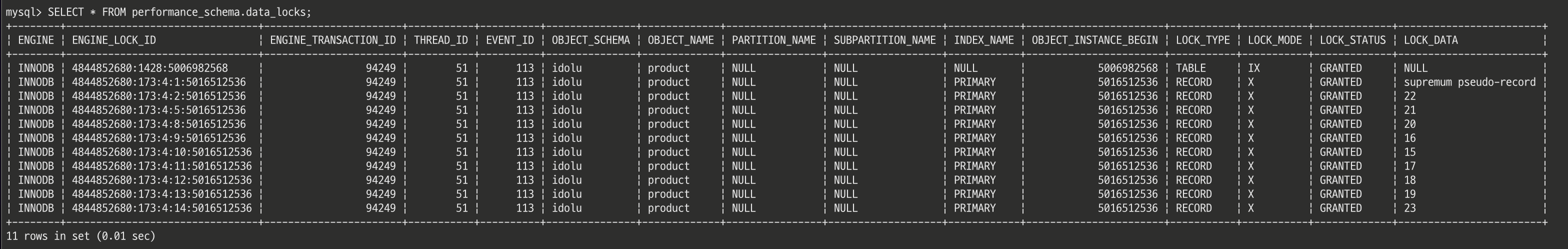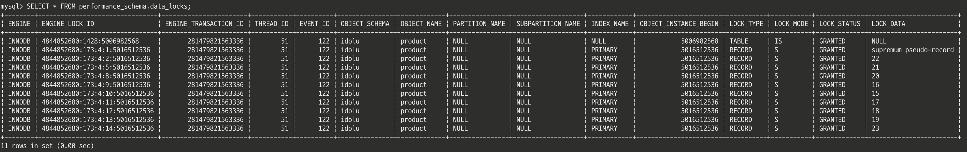 위 명령어를 실행하면 performance_schema.data_locks 테이블을 통해 InnoDB에서 발생한 락 정보를 조회할 수 있다.