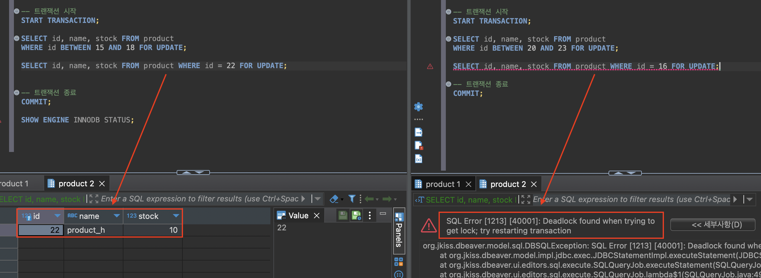 그리고 계속해서 실행하다보면 서로가 가진 잠금을 기다리면서 무한정 대기하는 데드락 상황에 빠지게 되는데 두 트랜잭션 모두 trx_status가 LOCK WAIT, trx_requested_lock_id가 NULL이 아닌 것을 확인하여 Lock이 대기중임을 알 수 있다.