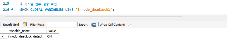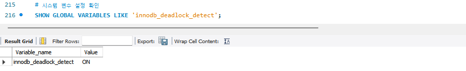 자동 데드락 감지 비활성화를 하려면 위 명령어를 통해 설정할 수 있다. 그리고 확인해보면 Value 컬럼이 OFF인 것을 확인할 수 있다.
