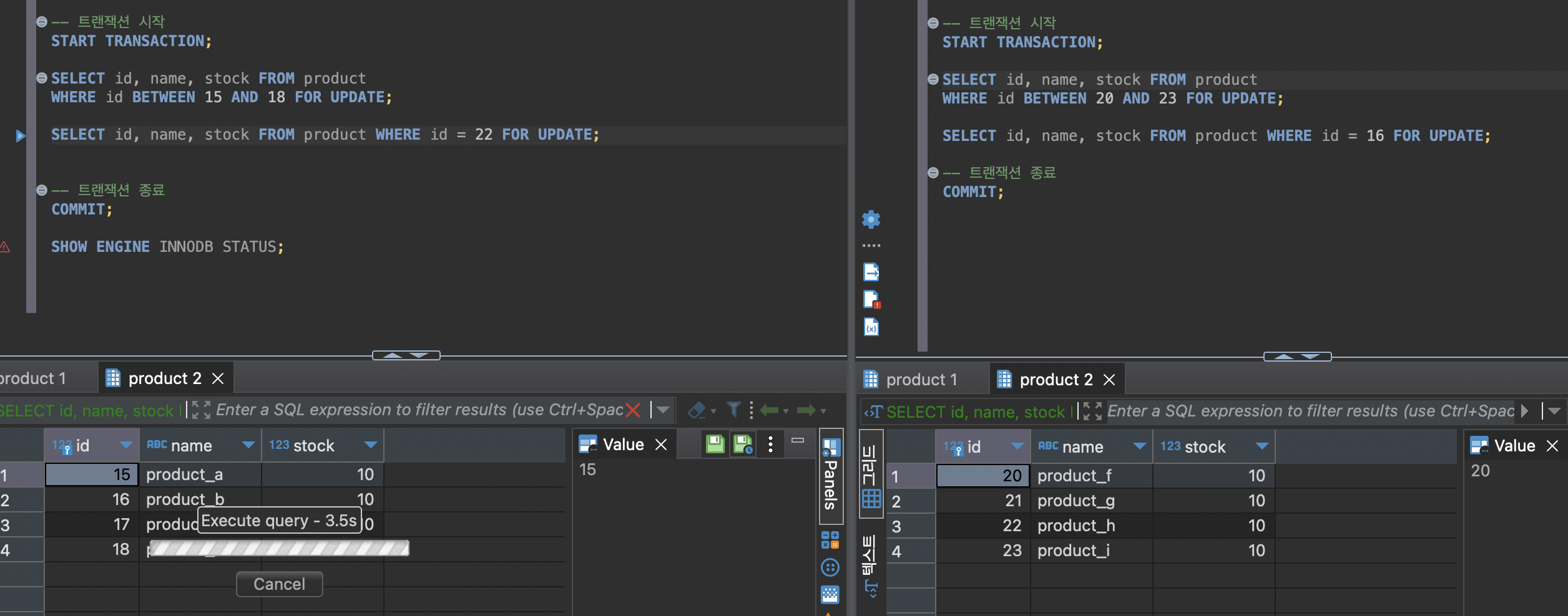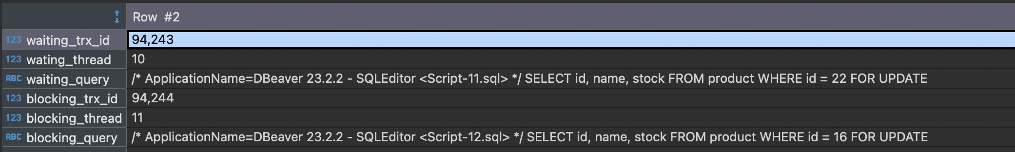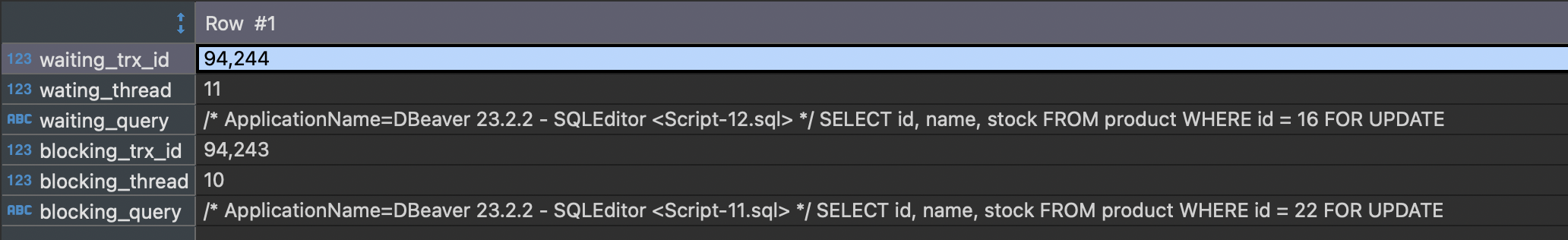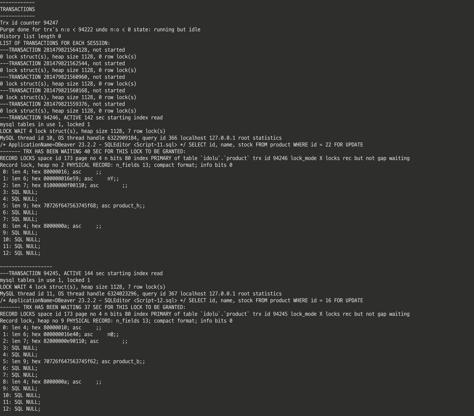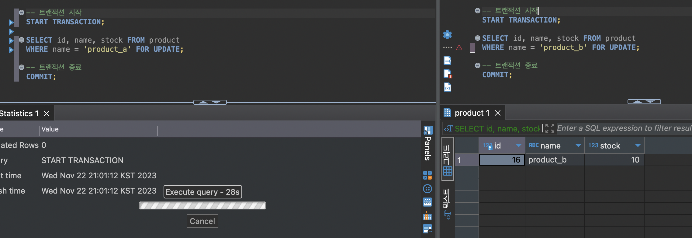 이 때 transaction_a에서 SELECT ... FROM product WHERE id = 22 FOR UPDATE;를 실행하면 transaction_b에서 배타락을 가지고 있기 때문에 잠금 대기 상태인 것을 확인할 수 있다.