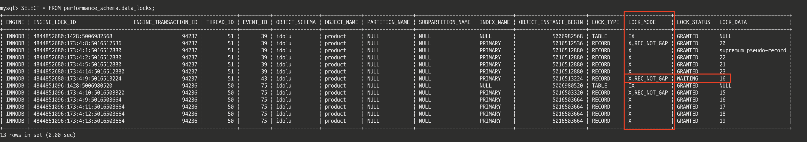 LOCK_MODE 컬럼은 InnoDB에서 특정 레코드에 대한 락 모드를 나타내는 값을 말한다. S는 Shared Lock, X는 eXclusive Lock을 나타낸다. FOR UPDATE를 통해 배타락으로 조회한 레코드들에 대해서 다른 트랜잭션에서 배타락으로 접근하려고 하면 위를 보는 것처럼 LOCK_MODE 컬럼이 X, LOCK_STATUS가 WAITING인 것을 확인할 수 있다.