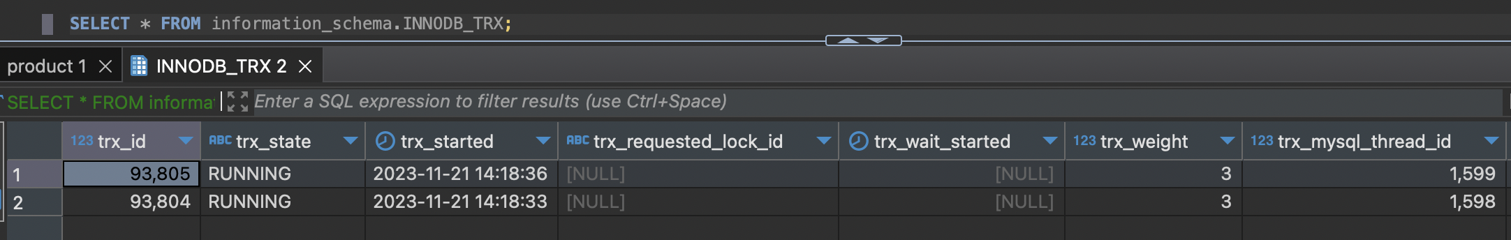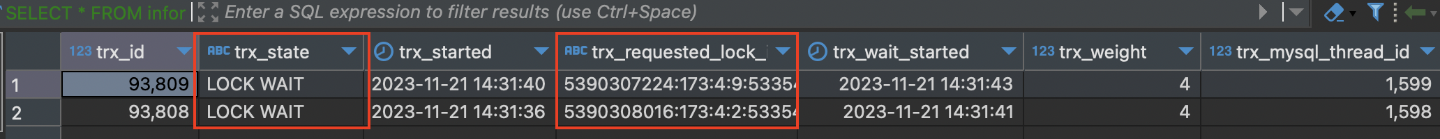그리고 위 예시와 동일하게 transaction_a와 transaction_b를 시작하고 SELECT 쿼리까지 실행한 후 SELECT * FROM information_schema.INNODB_TRX;로 조회하면 두 trasaction에 대한 정보가 나오는 것을 확인할 수 있다.